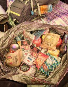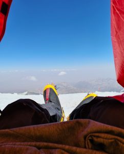 Llego a C3 y voy directamente a hablar con la «Camp Manager, tiendas 18 y 19. Hoy duermo con Diego. Me meto y comienzo a cambiarme la ropa húmeda. Llegan Diego y Julio, me preguntan si he ido a por la bolsa de material del «Mallorca Team», les digo que no, que había caído. Diego vuelve a los 2 minutos, esto es lo mejor que nos podría haber pasado. Los mallorquines hicieron un porteo de viveres a C3, pero finalmente todos (cuatro) tuvieron que abandonar. Nos dejaron arriba botellas de gas, sobres de café, sopas, pan, queso, sobres de jamón… la definición de «el cielo abierto» es poco.