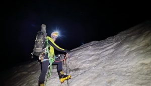 Fue justo en el primer repecho, a unos 15 minutos de las primeras cuerdas fijas cuando Chencho dijo que se daba la vuelta. Nos dijo que estaba fuera de punto y no se encontraba. Realmente no íbamos a un ritmo fuerte, pero si que considero que deberíamos de haber ido un poco más despacio. Como todavía el terreno que habíamos recorrido era seguro, los cuatro estábamos de acuerdo en que se volviera solo a C1. Chencho es un tío con experiencia y no le iba a pasar nada. Además, era solo cansancio, si llega a ser por algún síntoma de MAM o algo grave si que no lo hubiéramos dejado solo.