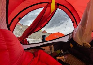 Nos despertamos, más o menos, con la salida del sol y definitivamente descartamos la idea de subir a C3. Pensábamos salir a las 8:00 independiente de lo que hicieramos. Durísimo salir del saco y empezar a ser persona. Haces estrictamente lo que está en el área de acción (sin salir del saco). Te pones los calcetines. Bebes algo de agua. Piensas en hacer la mochila pero es imposible, todo está lejos. Te sientas 30 segundos y vuelves a tumbarte. Es como salir de la cama en invierno, pero mil veces peor. A eso de las 9:30 ya habíamos desayunado y estábamos listos para salir.